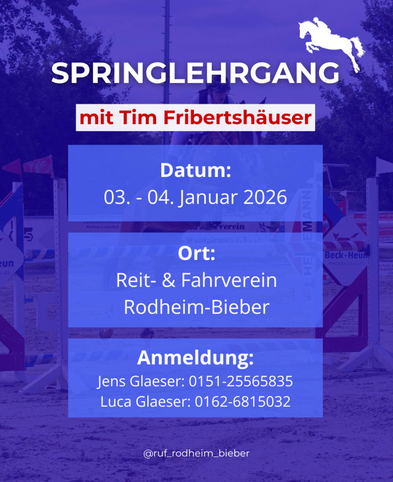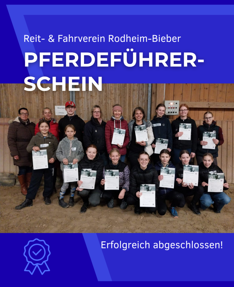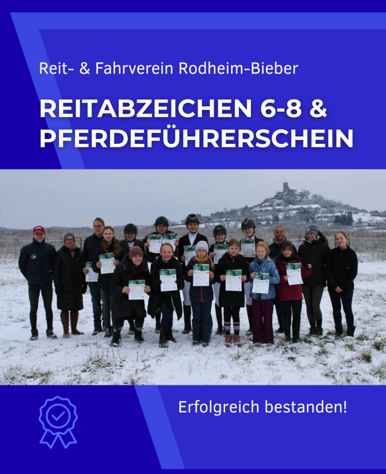 Der Reit- und Fahrverein Rodheim-Bieber bietet vom 05. bis 09. Januar 2026 den Lehrgang für die Reitabzeichen 4–8 sowie den Pferdeführerschein an. Die Prüfung findet am 10. Januar 2026 statt.